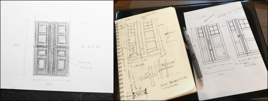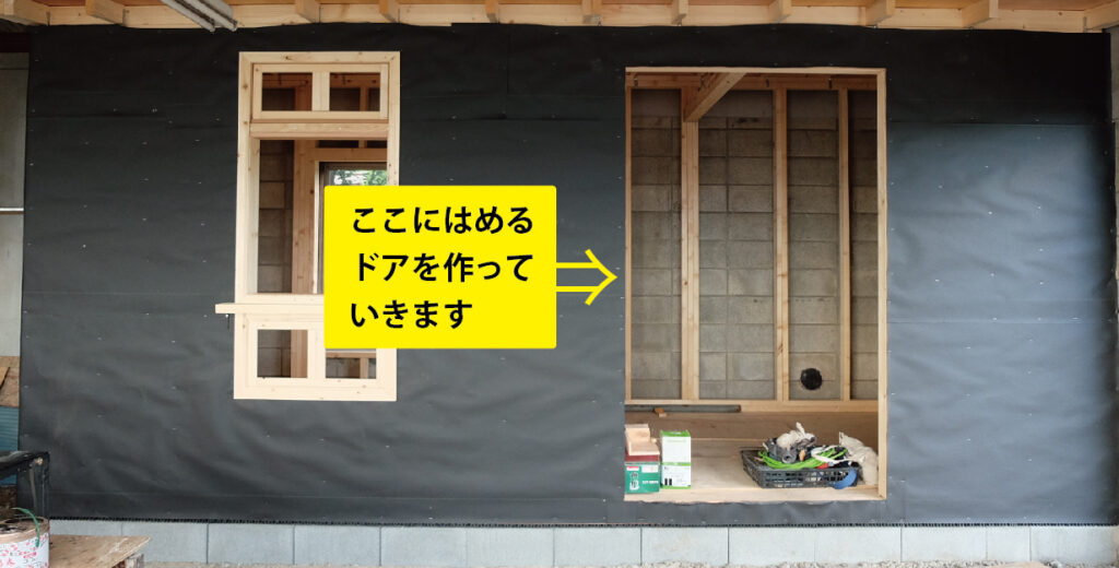 焙煎小屋のこの開口部に観音開きのドアを付けます。