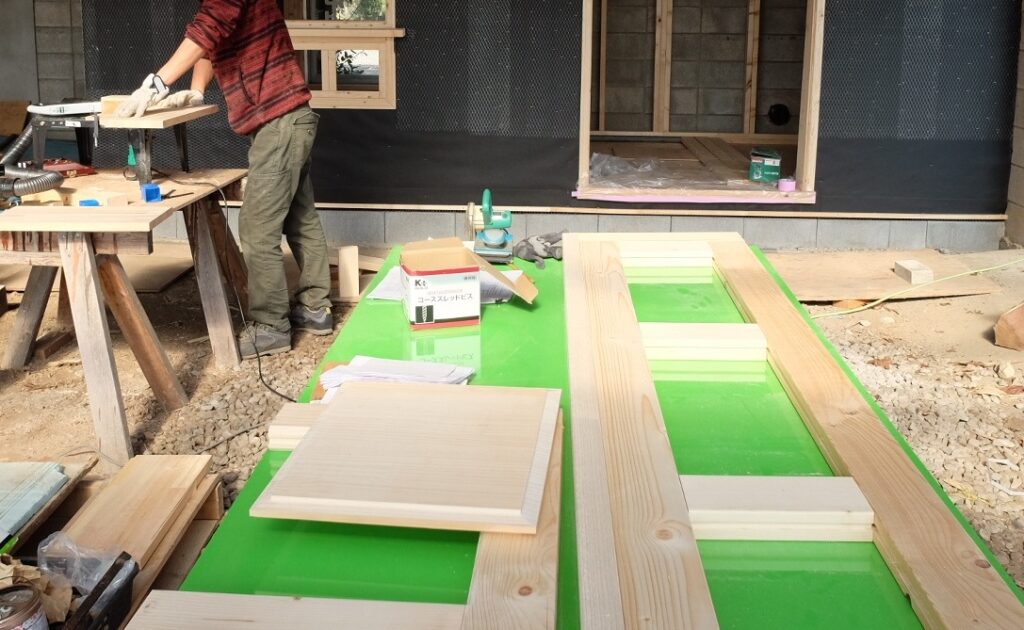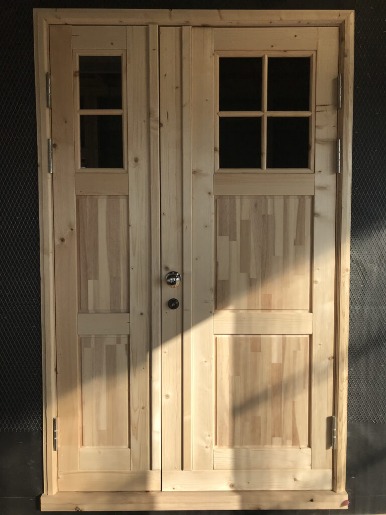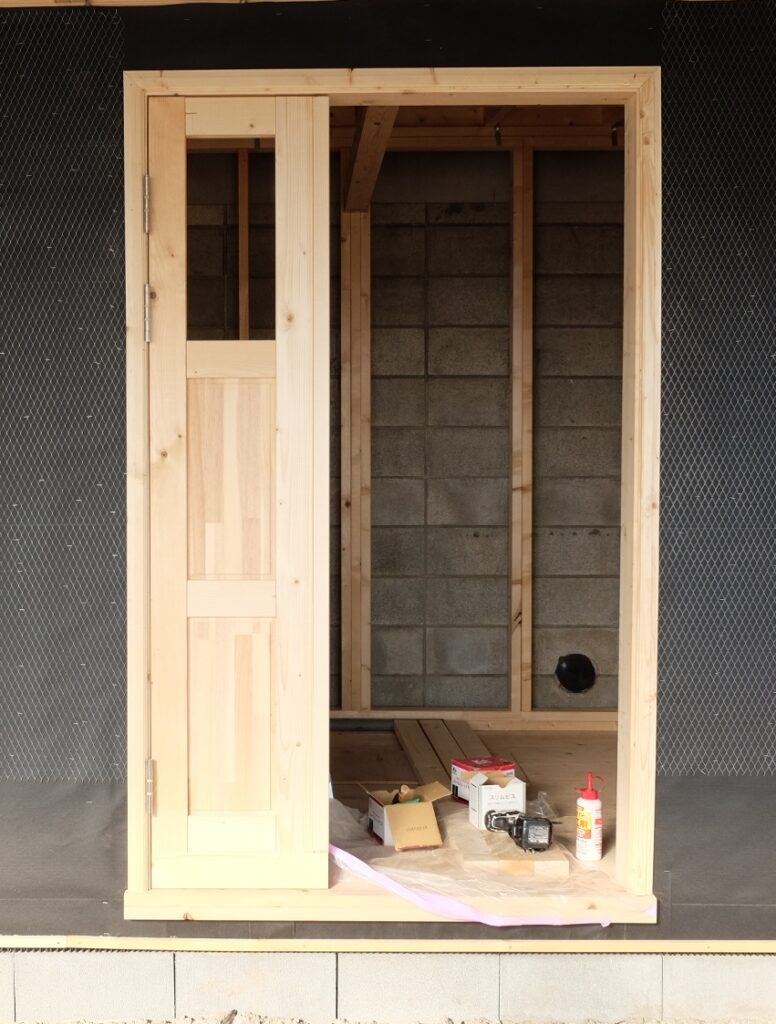焙煎小屋のドアを自作します。自宅のハーフビルドでは、既製品のドアを取り付けたので(普通そうですが)ドアを一度作ってみたいという夢があり、この際、作ってみようとなりました。