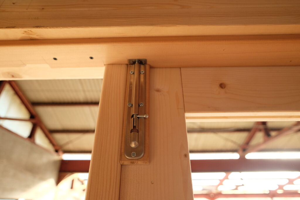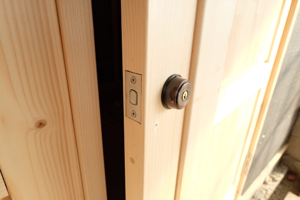 観音開きに、ドアノブや鍵を付ける場合、閉めるときにどちらかを固定しないといけないので、左側のドアにフランスおとしを付けました。