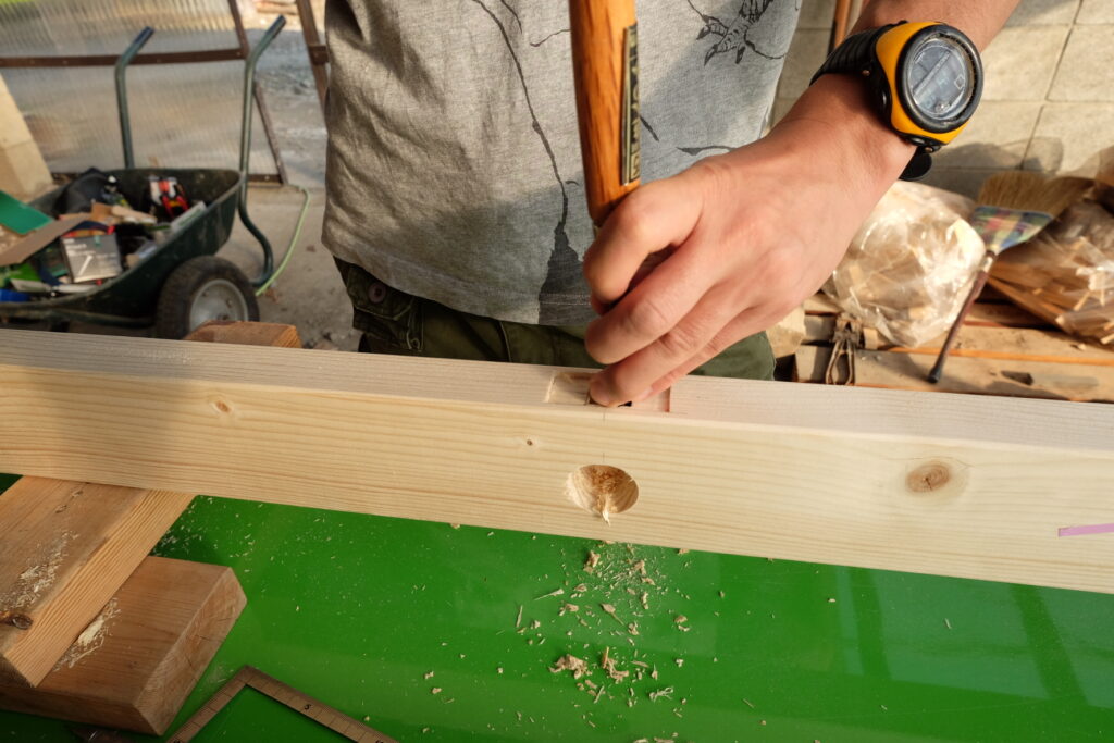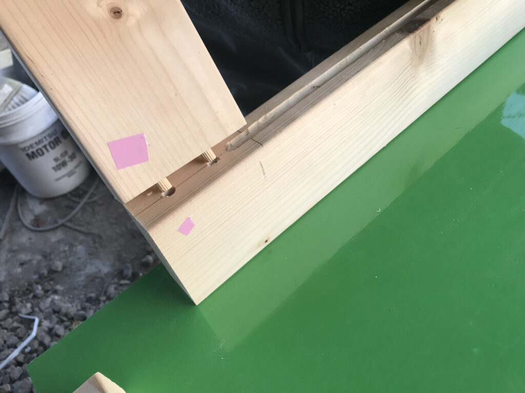 周りの部材(ツーバイ材)にホゾを掘り、間には集成材板。トリマーで端を削りホゾにはめるようにします。