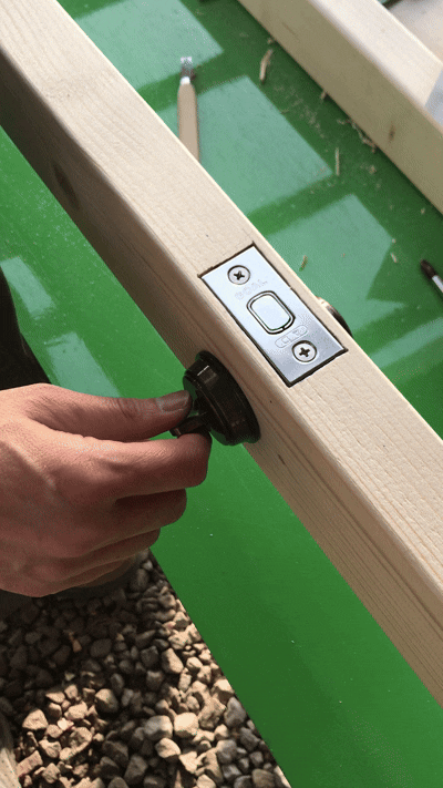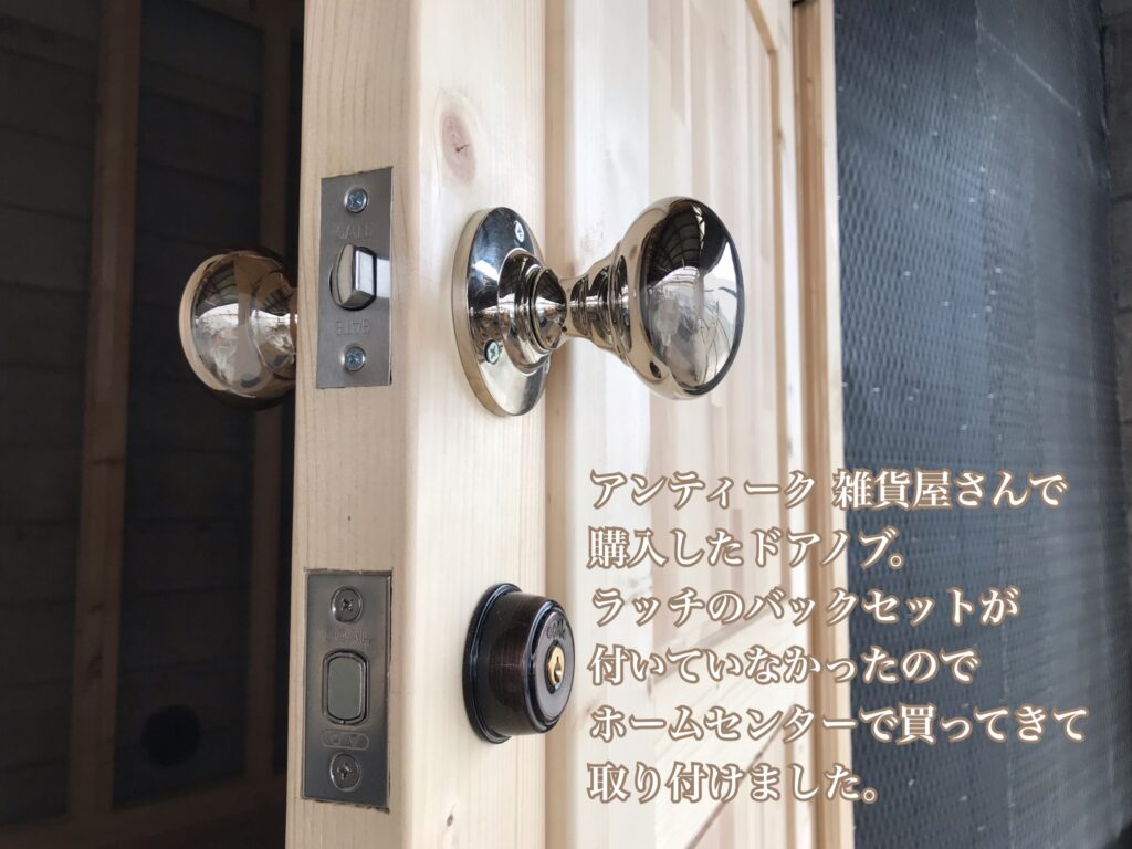 そしてアンティークのドアノブも付けました。これは回りません。ほぼ飾り。ラッチは単独のものです。